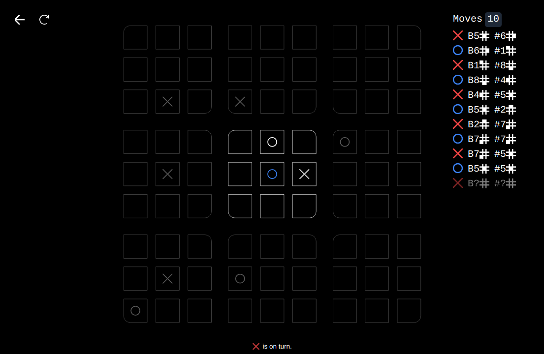 Online Tic-Tac-Toe game that can be played with a friend locally or online. Play across 3x3 boards, each with a "classic" 3x3 grid inside. When you play your move, the next player has to play in the board that corresponds to the cell you played in. The corresponding grid is highlighted when you hover over a cell. Please note that the rules are slightly different that what's normally known as utlimate tictactoe.